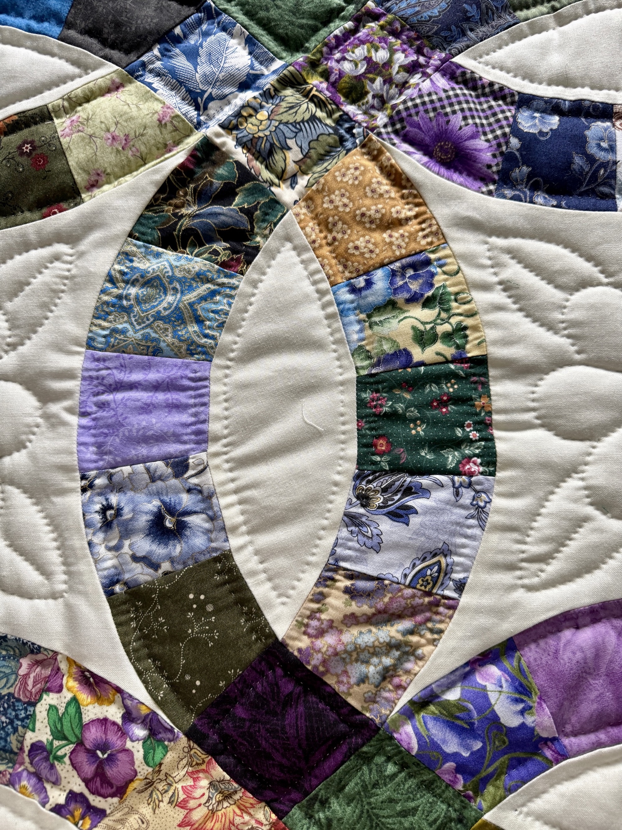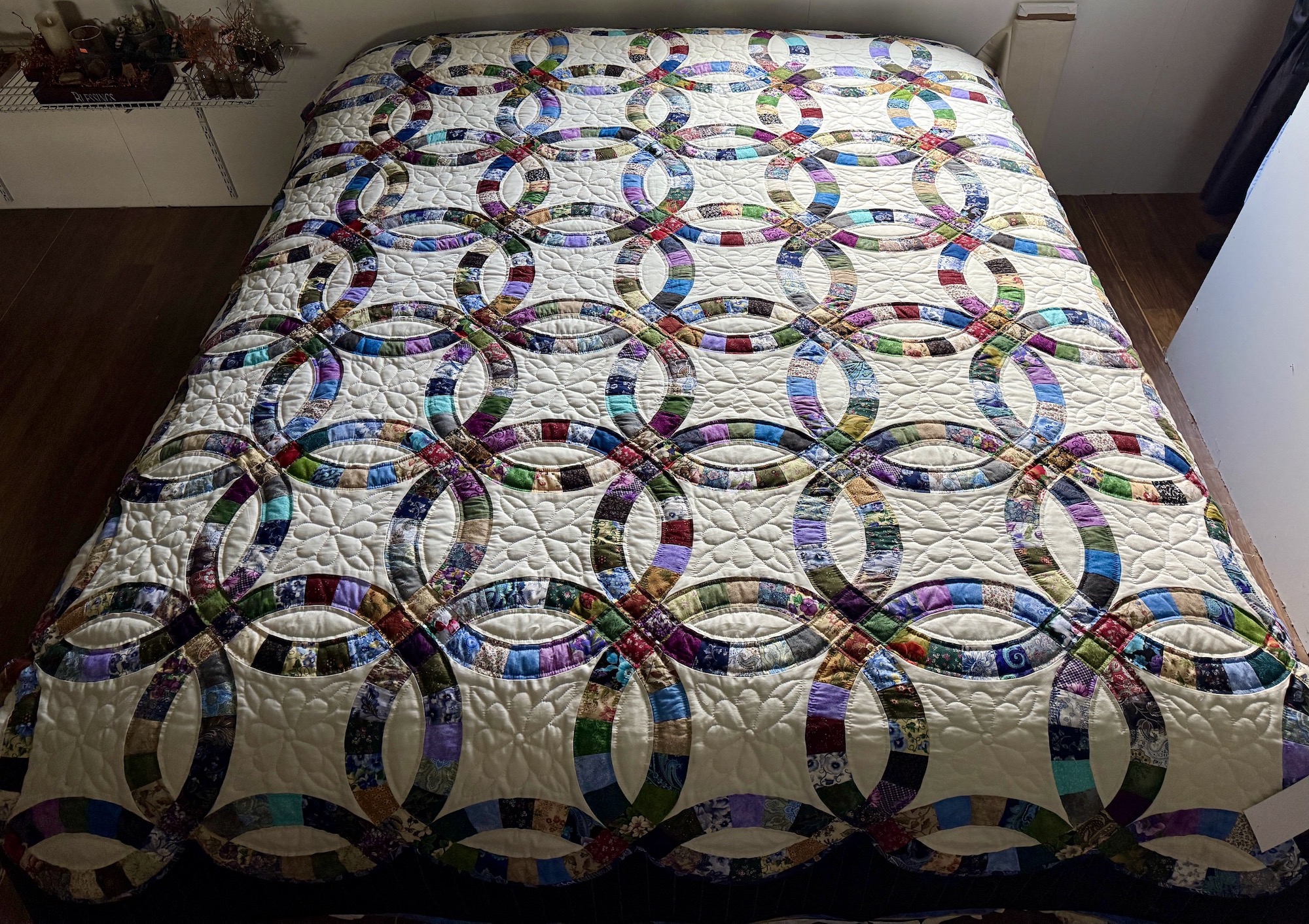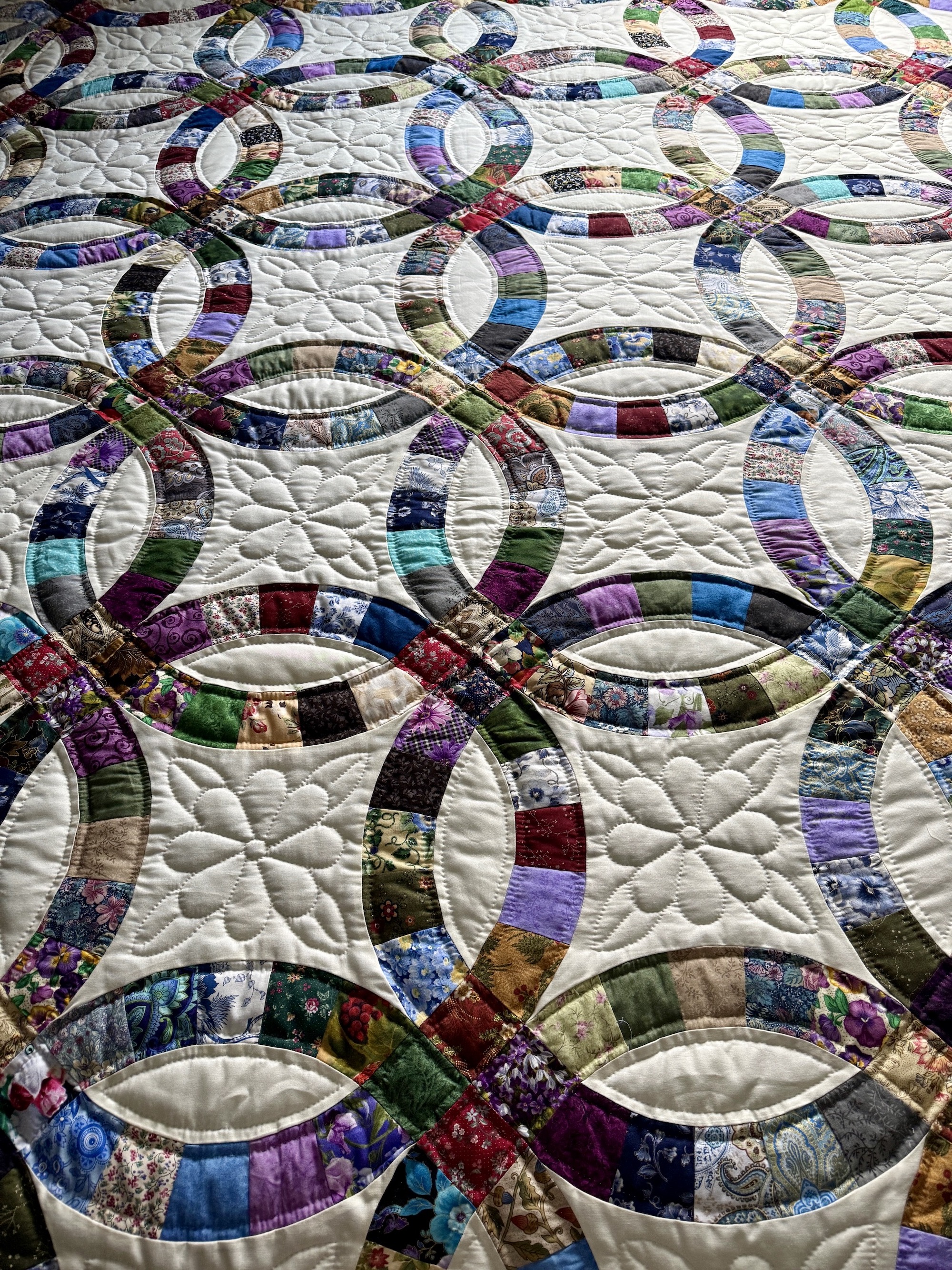 Here’s a Double Wedding Ring baby quilt that has been scaled down to baby size. Dye fast fabrics are a mix of solids and  prins over a white background. The edges are scalloped and hand bound. Hand quilted hearts are featured in the centers of the rings.